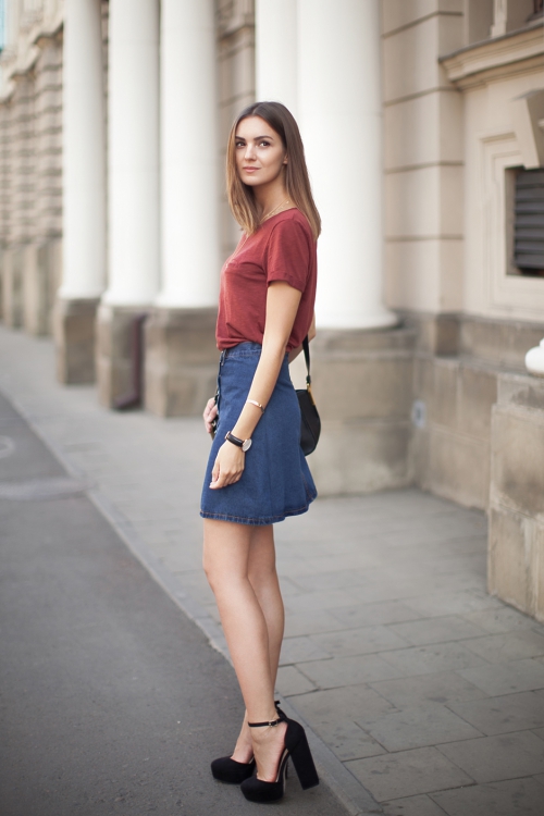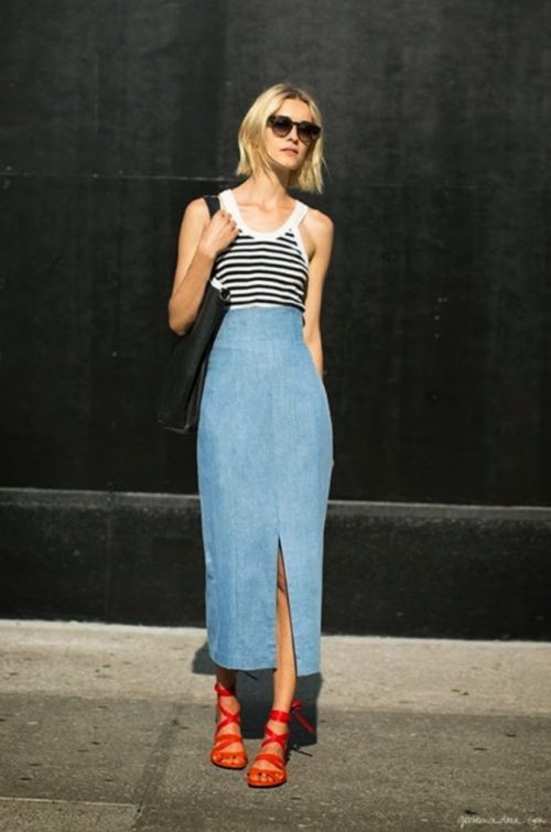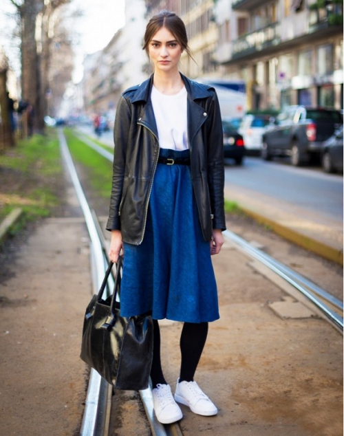 #5 ลุคนี้เก๋สุดๆ แมทช์กับเสื้อยืดแขนสองส่วนเข้ารูป กระโปรงเดนิมบานๆ นิดความยาวเลยเข่า และรองเท้ารัดส้น