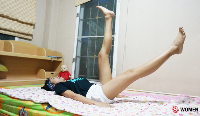 ท่าที่ 1 นอนราบ ยกขาชี้ฟ้าคู่ จากนั้นยกขาขึ้นลง ทำสลับกันทีละข้าง ให้ขาตั้งฉากกับลำตัว ทำแบบช้าๆ ค่อยเป็นค่อยไป พร้อมเกร็งหน้าท้องด้วย ถ้าทำไม่ได้และรู้สึกว่ากล้ามเนื้อตีง ให้งอเข่าเล็กน้อย เพื่อไม่ให้กล้ามเนื้อฉีกค่ะ