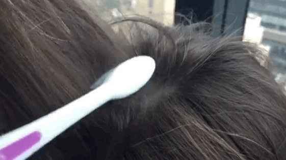 ใช้แปรงสีฟันที่สะอาดและยังไม่ได้ใช้ มายี ๆ ที่โคนผมค่ะ ค่อย ๆ ทำไปเรื่อย ๆ ตามแนวผมค่ะ หลังจากนั้นเปลี่ยด้าน ทำแบบเดิมซ้ำ