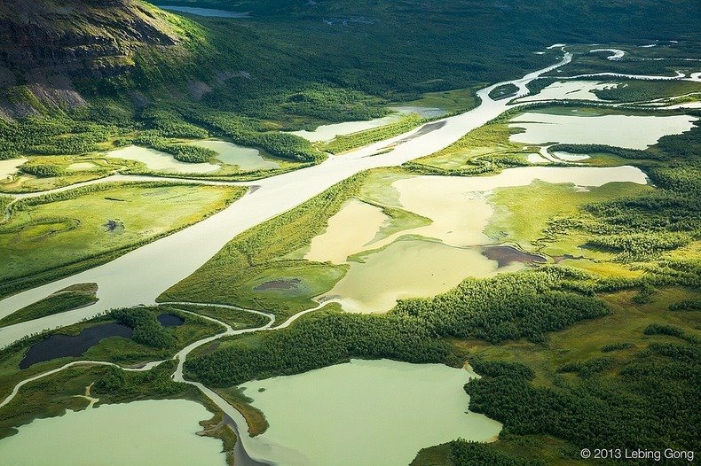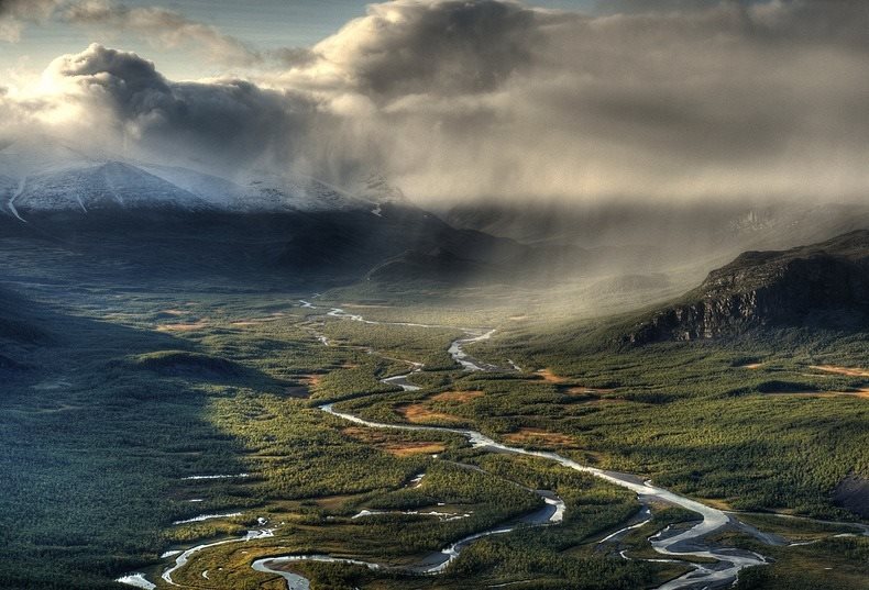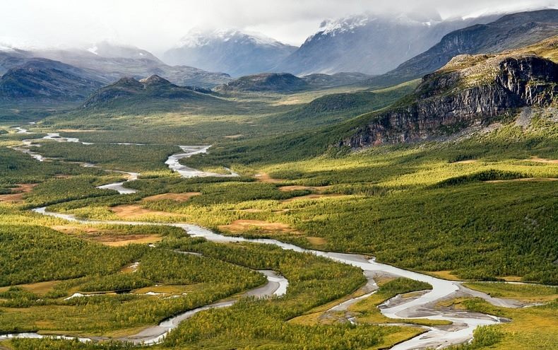 ณ แม่น้ำ Rapa เป็นเส้นทางน้ำคดเคี้ยวไหลผ่านอุทยานแห่งชาติซาเรค เส้นทางยาวราว 75 กิโลเมตรจากต้นกำเนิดของแหล่งน้ำผ่านไปยังธารน้ำแข็ง Sarektj?kk? และมีส่วนหนึ่งที่มีระยะทาง 35 กิโลเมตรไหลผ่านเขตอุทยานแห่งชาตินี้ เส้นทางน้ำคดเคี้ยวไร้รูปแบบผ่านแนวพุ่มไม้ ต้นไม้เขียวขจีและหนาแน่น คราคร่ำไปด้วยสารพัดสิ่งมีชีวิตที่อาศัยอยู่อย่างสงบ ทำให้ภาพมุมสูงของสถานที่แห่งนี้ดูสวยมีแสน่ห์สงบและร่มเย็น จนได้ชื่อว่าเป็นดินแดนลุ่มน้ำที่สวยที่สุดในแถบสแกนดิเนเวียน
