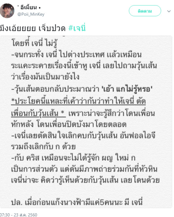 จากข่าวฮอต ประเด็นฮิตที่คนพูดถึงกันมากที่สุดคงหนีไม่พ้นเรื่อง เจนี่อันฟอลโล่ไอจีวุ้นเส้นและคริส หอวัง ที่เจนนี่ พูดให้สัมภาสไปเมื่อวาน ทำให้คนอยากรู้กับประโยคคำตอบของวุ้นเส้น ที่ทำให้เจนนี่ อึ้งกับคำตอบที่ได้มา ว่าวุ้นเส้นพูดว่าอะไร และล่าสุดก็มาชาวเน็ตมาให้ข้อมูลเพิ่มเติมว่ากับคำตอบของวุ้นเส้น ที่พูดกับสาวเจนี่ หลังจากที่เจนี่รู้ความจริงเรื่องสาวใหม่ของอดีตหวานใจหนุ่มกึ้ง แต่ก็ไม่รู้ว่าข้อมูลที่ชายเน็ตแจงมานั้น จะเป็นเรื่องจริงหรือไม่ ยังไงก็ต้องรอเจ้าตัวออกมาชี้แจงกับประเด็นดังกล่าวด้วยตัวเองเน๊อะ