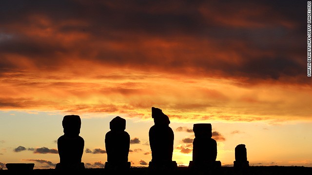 เกาะอีสเตอร์ ตั้งอยู่ในมหาสมุทรแปซิฟิก ห่างจากชายฝั่งชิลีประมาณ 3,700 กิโลเมตร นักท่องเที่ยวจะได้พบกับรูปปั้นหินลึกลับ หรือ โมอัย ที่สันนิษฐานว่าสร้างขึ้นในระหว่าง ค.ศ.1400-1600 โดยเหล่านักประวัติศาสตร์ยังไม่สามารถระบุที่มาที่ไปได้อย่างชัดเจน แต่ทว่าความสนใจในเรื่องจุดกำเนิดดังกล่าว ดูจะเป็นรองเรื่องภาพความงาม ยามพระอาทิตย์กำลังตกดิน แล้วแสงสีทองสะท้อนกระทบรูปปั้นปริศนาเหล่านี้