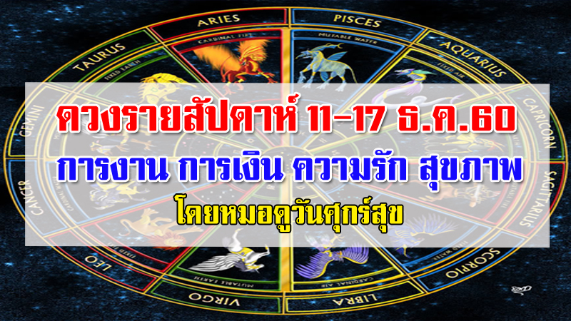 สวัสดีค่ะ..วันนี้ MarketJJ นำดวงรายสัปดาห์ประจำวันที่ 11-17 ธันวาคม 2560 มาฝากกันแล้วจ้า ซึ่ง หมอดูวันศุกร์สุข แห่ง Horoworld ได้พยากรณ์ดวงชะตา ด้านการงาน การเงิน ความรัก และสุขภาพของทั้ง 12 ราศี เอาไว้ดังนี้
