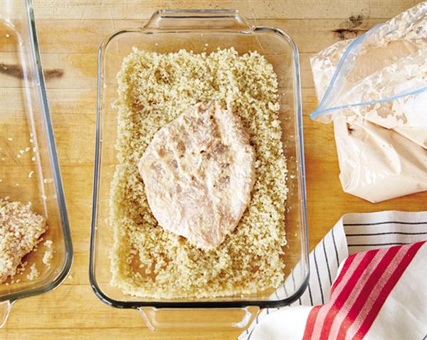 พอหมักไก่เสร็จแล้ว ก็ลองใช้ธัญพืชแทนการชุบด้วยเกล็ดขนมปังที่จะทำให้สาวๆ