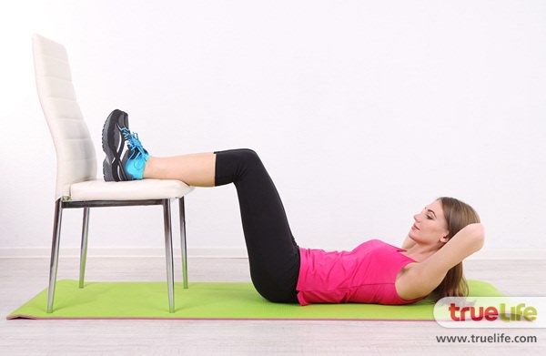 เพิ่มความแข็งแรงให้ลำตัวและกระชับหน้าท้อง ด้วยท่าซิทอัพ โดยวางขาทั้งสองข้างไว้บนเก้าอี้ มือรองไว้ด้านหนังศีรษะ จากนั้นยกศีรษะและลำตัวขึ้น ทำซ้ำ 1 นาที