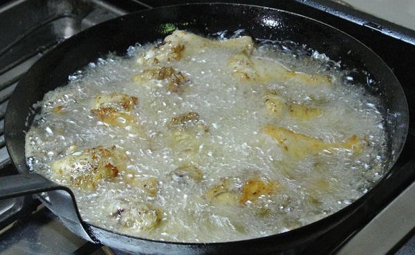 ตั้งกระทะ ใส่น้ำมันถั่วเหลืองลงไป (เคล็ดลับ : ที่ใช้น้ำมันถั่วเหลืองทอดเพราะรสชาติน้ำมันดีกว่าน้ำมันปาล์มที่ร้านไก่ทอดทั่วไปใช้ น้ำมันถั่วเหลืองนี้ทนอุณหภูมิสูงสู้น้ำมันปาล์มไม่ได้ แต่ทางร้านใช้น้ำมันปาล์มทอดเพราะใช้ทอดไก่ได้หลายครั้ง ต้นทุนน้ำมันต่ำกว่าน้ำมันถั่วเหลืองมาก ซึ่งน้ำมันถั่วเหลืองที่นำมาทอดนี้จะใช้ 2 ครั้งเท่านั้นแล้วทิ้งเลยหรือบางครั้งถ้าน้ำมันข้นก็จะทิ้งไปเลย และทดสอบความร้อนน้ำมันโดยใช้ตะเกียบจิ้มลงไป ถ้ามีฟองอากาศออกมา แสดงว่าน้ำมันร้อนเหมาะกับการทอดแล้ว) จากนั้นใส่ไก่ที่อบแล้วลงไปทอดประมาณ 10 นาที จนไก่ทอดสุกและกรอบ ตักขึ้นสะเด็ดน้ำมัน
