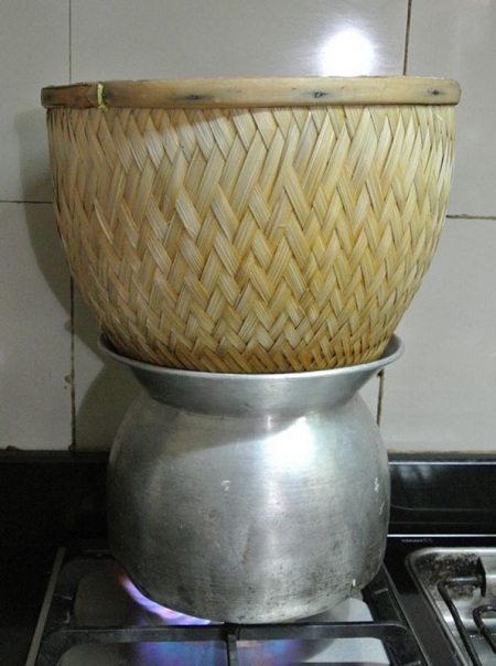 ระหว่างที่อบไก่ ให้นึ่งข้าวเหนียวไปด้วย