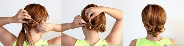 เริ่มจากการมัดหางม้าแล้วม้วนๆผมก่อน แล้วค่อยม้วนเป็นจุกแล้วติดกิ๊บดำค่ะ