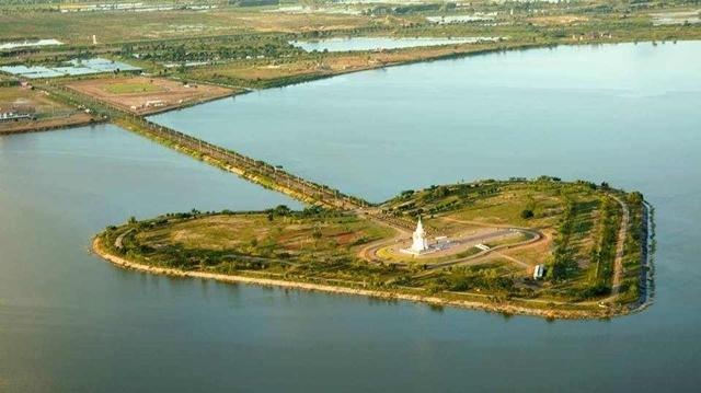 แผ่นดินศักดิ์สิทธิ์รูปหัวใจหรือเกาะรูปหัวใจ ถูกเนรมิตขึ้นมาได้อย่างงดงาม เกิดจากแนวคิดโครงการแก้มลิงตามแนวพระราชดำริเพื่อแก้ปัญหาน้ำท่วม-แล้ง โดยทำพื้นที่เก็บน้ำไว้ใช้ จากนั้นมีการทำ ?บุญพิธีกลั่นแผ่นดิน? นำดินจากทุกหมู่บ้านในจังหวัดสุโขทัย 843 หมู่บ้าน มาปลุกเสกและนำมาไว้ใต้ฐานของมณฑป ซึ่งเป็นที่ประดิษฐาน ?พระพุทธรัตนสิริสุโขทัย? จึงนับเป็นการนำความศักดิ์สิทธิ์มาสู่แผ่นดิน และรูปหัวใจยังสะท้อนถึงความรักใคร่สามัคคีของคนสุโขทัย ที่ช่วยกันรักษาสถานที่สำคัญแห่งนี้ไว้ให้คนทั่วโลกได้จดจำ