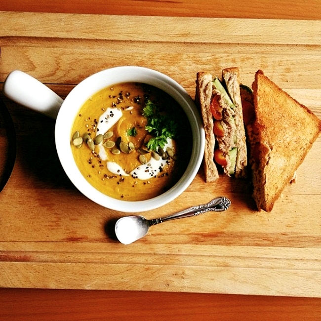 13. แซนด์วิชทูน่า ขนมปังกรุบกรอบ มาพร้อมซุปฟักทองผสมเต้าเจี้ยวและแครอท ทานคู่กัน เข้ากันทีเดียว