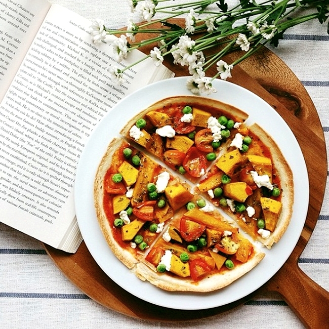 18. พิซซ่าแบบคลีนๆ มาพร้อมหน้าผักรวม อาทิ ฟักทอง ถั่วลันเตา มะเขือเทศ พริกหยวก โรยด้วยเครื่องเทศหอมกรุ่น