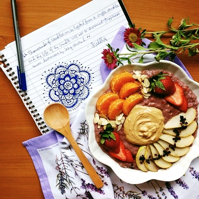 5. ข้าวโอ๊ตผสมเบอร์รี่ ราดด้วยเนยถั่ว มาพร้อมกับแอปเปิ้ลสไลซ์บางๆ ส้ม สตรอเบอร์รี่ และอัลมอนด์ฝานบางๆ เพิ่มสีสันและคุณค่า