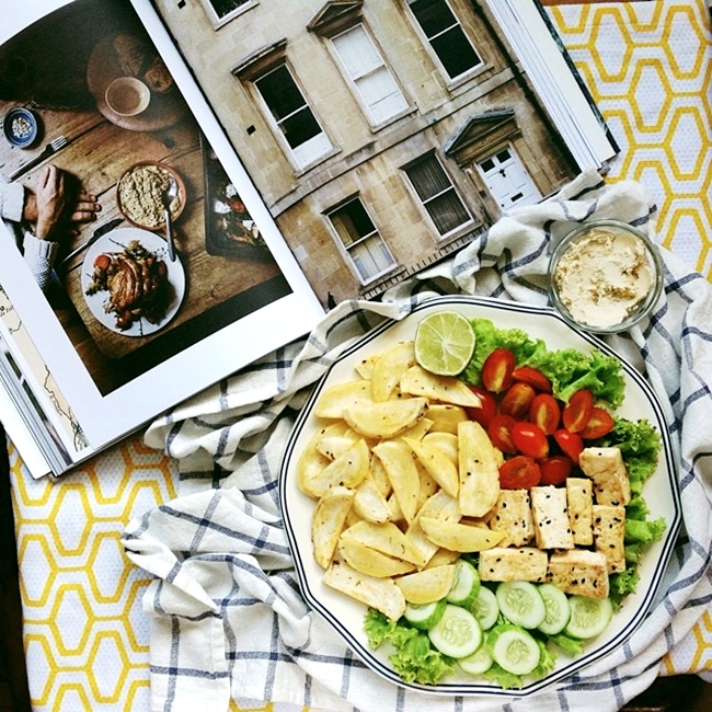 4. มันหวานอบ เต้าหู้ และผักสลัด มะเขือเทศ แตงกวา บีบมะนาวราดให้รสเปรี้ยวอร่อยหรือทานคู่ครีมชีส ก็รสชาติดี แถมดีต่อสุขภาพ