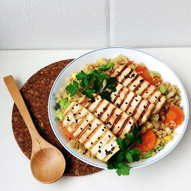 12. ข้าวผัดควินัว พร้อมด้วยแครอท หัวหอม ข้าวโพด ถั่วแระญี่ปุ่น พร้อมด้วยสเต็กเต้าหู้ราดซอสน้ำผึ้ง ชวนหิวอย่างสุขภาพดี
