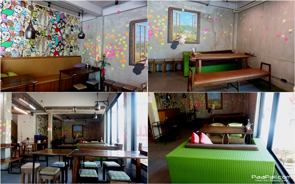 แปะตามกำแพงไปทั่วน่ารักดี ระหว่างรออาหารก็นั่งงานเพลิน ๆ เหมือนกันครับ