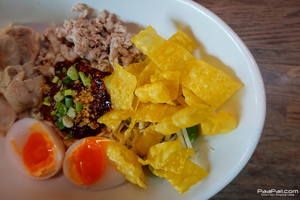 ชามนี้ประกอบไปด้วยเครื่องอย่าง หมูสับ, หมูชิ้น, เกี๊ยวกรอบ