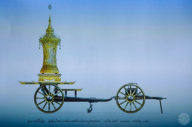 ภาพแบบราชรถปืนใหญ่ ที่ใช้เชิญพระโกศพระบรมศพเวียนรอบพระเมรุมาศ ในพระราชพิธีถวายพระเพลิงพระบรมศพ พระบาทสมเด็จพระปรมินทรมหาภูมิพลอดุลยเดช (ออกแบบเขียนแบบโดย นายชนะโยธิน อุปลักษณ์ สำนักช่างสิบหมู่ กรมศิลปากร)