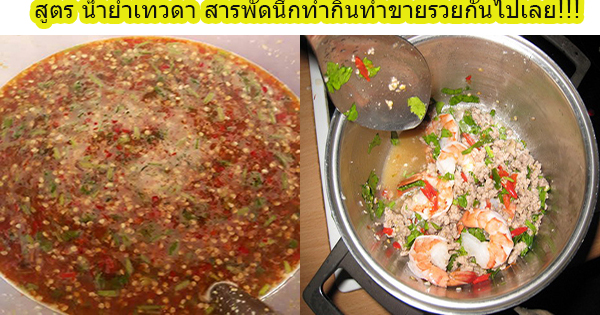 นำภาชนะมาตักน้ำเปล่าใส่ 2 ช้อนโต๊ะน้ำกระเทียมดอง 1 ช้อนโต๊ะบีบน้ำมะนาวใส่ 6 ช้อนโต๊ะกลมกล่อมด้วยน้ำตาลปี๊บ 1 ช้อนโต๊ะหวานหอมด้วย น้ำตาลทราย 1 ช้อนโต๊ะซอสมะเขือเทศเป็นเคล็ดลับ…น้ำยำเทวดา เพื่อช่วยสร้างสีสรรค์ให้อาหารทุกชนิด สีสด สวย 1 ช้อนโต๊ะผงปรุงรส…จะใส่หรือไม่ใส่..ก็ได้ เพราะไม่เน้นใส่กระเทียมสับ 2 ช้อนโต๊ะตามด้วยพริกสับ 2 ช้อนโต๊ะ ถ้า 3 ช้อนโต๊ะใช้ช้อนคนให้ส่วนผสมเข้ากันเปิดไฟใช้ความร้อนปานกลาง เคี่ยวส่วนผสม พอน้ำยำเดือดจับเวลา 2 นาทีต้องหมั่นคนอยู่ตลอดเวลา กลัวเดือดฟู …ล้นภาชนะปิดไฟใช้ได้แล้ว ” น้ำยำ เทวดา สารพัดนึก “รอให้เย็นสักพัก เทใส่ขวด..นำเข้าตู้เย็นเก็บไว้ใช้..