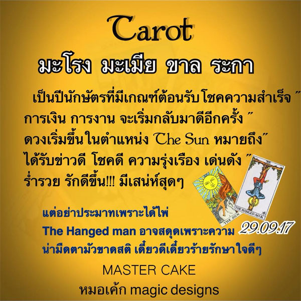 ทำนายวันที่ 29 กันยายน 2560 มีผลทำนายประมาณไม่เกิน 6 เดือน เป็นคำทำนายจากไพ่ยิปซี สำรับ Master ซึ่งเป็นสำรับไพ่ที่แม่นยำที่สุดของหมอเค้ก