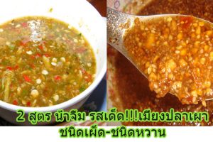 สูตรนำจิ้มเมี่ยงปลาเผา มีอยู่ 2 สูตรดังนี้ ส่วนผสมน้ำจิ้มชนิดเผ็ด : พริกขี้หนูสวน 1/2 กก. รากผักชี 2 ขีด กระเทียมดอง 2 ขีด กระเทียมแบบกลีบป…