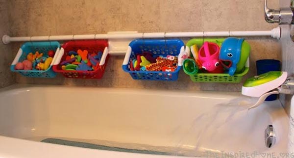 10. ทำราวแขวนตะกร้าของเล่นในห้องน้ำ