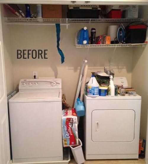 แล้วหาตะกร้ามาวางไว้จัดเก็บพวกผงซักฟอก น้ำยาปรับผ้านุ่ม น้ำยาซักผ้า