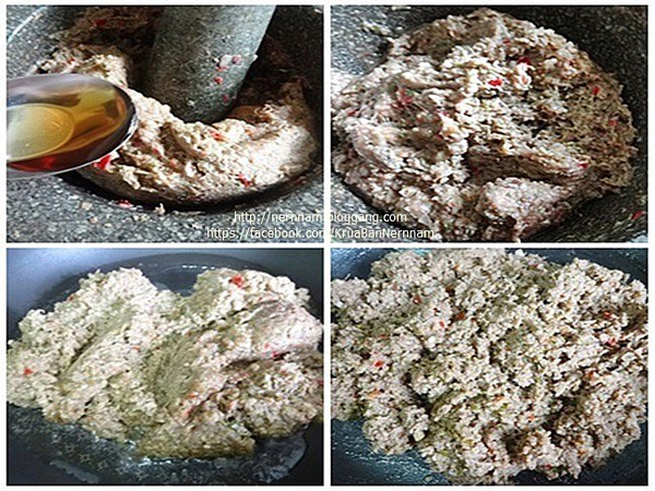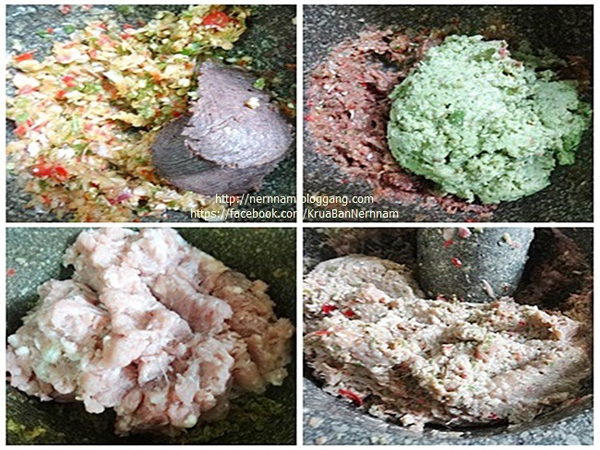 3. โขลกพริกขี้หนู กระเทียม และหอมแดงพอหยาบ แล้วใส่กะปิลงไปโขลกให้เข้ากัน ตามด้วยหมูสับโขลกให้เข้ากันอีกครั้ง