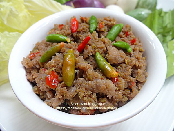 ส่วนผสม                      หมูสับ 300 กรัม           มะขามอ่อน 120 กรัม           เกลือป่น 1/2 ช้อนชา           พริกขี้หนูสวน 70 เม็ด (ชอบเผ็ดให้เพิ่มพริกค่ะ)           กระเทียม 20-25 กลีบ           หอมแดง 2 หัว           กะปิ 2 ช้อนโต๊ะ           น้ำตาลปี๊บ 1 1/2 – 2 ช้อนโต๊ะ           น้ำปลา 1 1/2 ช้อนโต๊ะ           น้ำมันสำหรับผัดเล็กน้อย           ผักสดตามชอบ