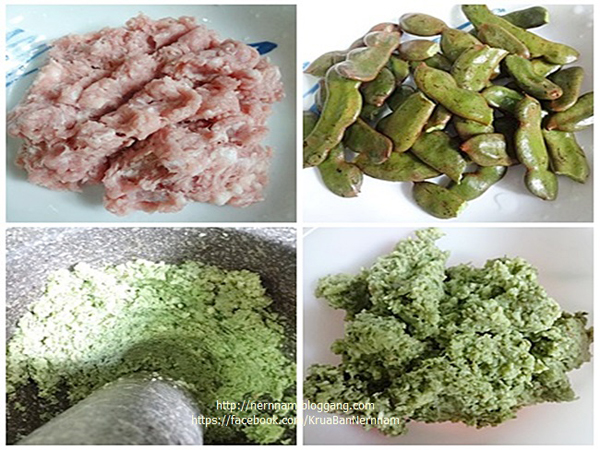 1. สับหมูสับเตรียมไว้                      2. นำมะขามอ่อนมาล้างทำความสะอาดผิว พักให้สะเด็ดน้ำ จากนั้นใส่ลงในครก ใส่เกลือป่นลงไปโขลกให้ละเอียด ตักขึ้นพักไว้ (การใส่เกลือจะทำให้มะขามไม่ดำค่ะ)