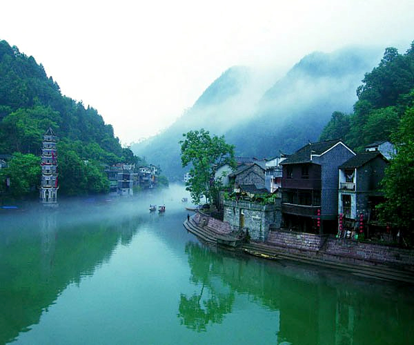 เมืองเฟิ่งหวง ได้รับการยกย่องว่าเป็นเมืองที่สวยงามที่สุดของจีน แม่น้ำถัวเจียงไหลตามกำแพงเมืองโบราณ ภูเขาเขียวขจีสะท้อนเงาที่แม่น้ำ ชูร่มกระดาษ และจับมือกับคนรักเดินในสายฝนอย่างโรแมนติก เป็นภาพที่ประทับใจมาก