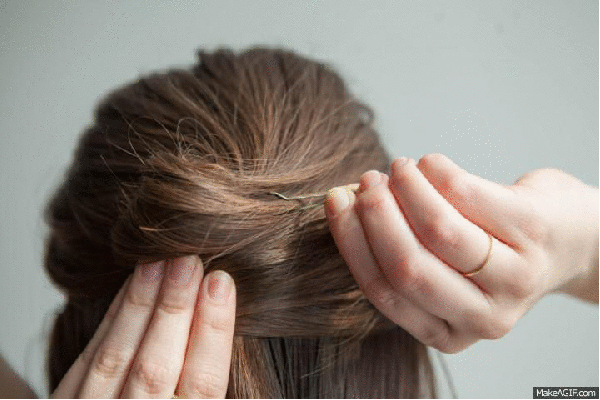 ใช้ Bobby pin ให้เป็นแนวเดียวกับผมที่ต้องการยึดไว้ หลังจากนั้นให้เอียงกิ๊บไปด้านหน้าและเสียบย้อนกลับไปในทิศทางแรก ดันกิ๊บเข้าไปให้ลึกและแน่น