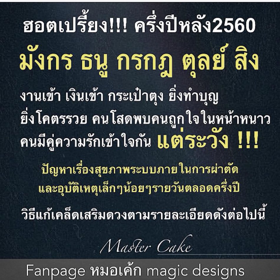 ราศีมังกร จะเป็นกิ้งกือหรือไม่ ไม่รู้ รู้แต่งานเยอะ จนไม่มีเวลาใช้เงิน 555 แต่ไม่เป็นไร มังกรมีคนช่วยใช้เยอะครับ สู้ๆ หาเงินเพื่อคนที่เรารักดีกว่าหาให้คนอื่น รวยครับปีหน้าแต่ปีนี้ให้เอางานก่อน เดี๋ยวเงินมาแน่นอน !!!! ความรัก มีสตินะ ถ้ารักก็ต้องดูแลกันอย่าทำร้ายคนรักด้วยความรู้สึกโมโหจากงานมาลงที่เขา เพราะเขาไม่ใช่ส้วม รองรับขี้!!! มีเงินแต่ไม่มีคนข้างๆ ก็ไม่ต่างจากราชินีไร้บัลลังก์ หึหึ คนโสด คนจะเข้ามาเยอะ แน่นอนสวยฮอตช่วงหน้าหนาวครับมังกร แก้เคล็ดด้วยการปล่อยปลาหมอนะ เพราะไมเกรนกำเริบตลอดระวังโรคปวดกระดูกเส้นเอ็น การบาดเจ็บช่วงขา-เท้า