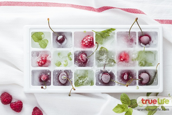 สำหรับวิธีทำก็ไม่ยากเลยค่ะ เพียงแค่สาวๆ นำผลไม้ที่ชอบ ไม่ว่าจะเป็นสตรอเบอร์รี่ ราสป์เบอร์รี่ บลูเบอร์รี่ และส้ม มาหั่นเป็นชิ้นเล็กพอประมาณ แล้วใส่ลงในถาดทำน้ำแข็ง ใส่น้ำเปล่าลงไป แล้วนำไปแช่ช่องฟรีซจนแข็ง เพียงเท่านี้ก็ได้ก้อนน้ำแข็งสุดอร่อย ที่มีเนื้อผลไม้ให้เคี้ยวกรุบๆ แล้วล่ะค่า