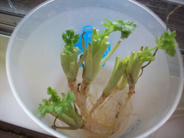 ก่อนที่จะปลูกผักชีในน้ำแนะนำให้ตัดลำต้นส่วนล่างที่มีรากติดอยู่ด้วยไปล้าง