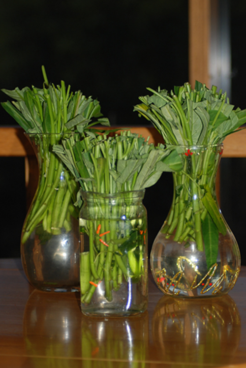 โดยตัดต้นผักบุ้งส่วนล่างที่มีรากติดไปล้างทำความสะอาดอย่างเบามือ