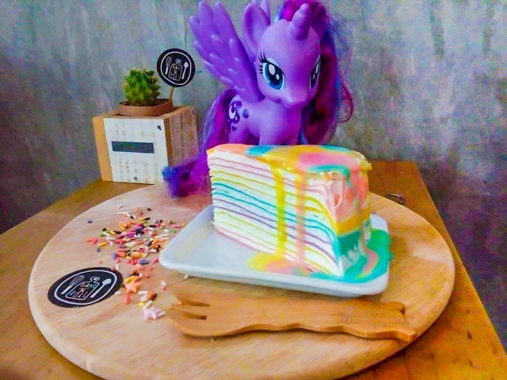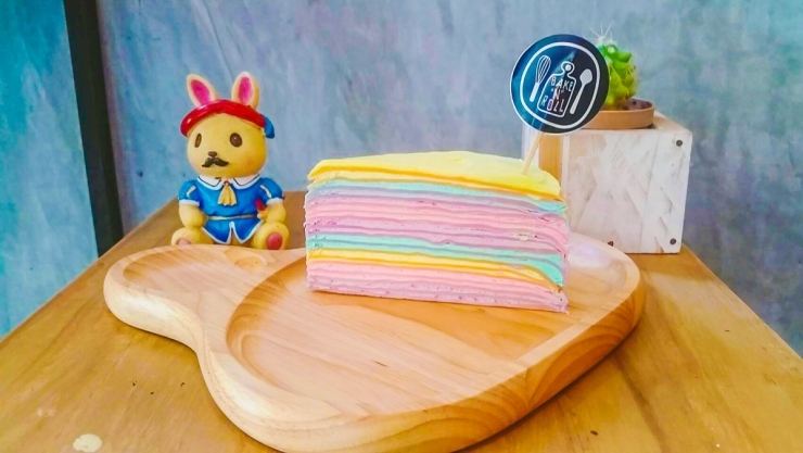 เครปเค้กครีมเรนโบว์ เครปเค้ก เรียงชั้นสวย สีหวานแบบนี้ ถูกใจสาวๆ แน่นอน เนื้อเครปนุ่ม เสิร์ฟพร้อมบลูเบอร์รี่ซอส รสเปรี้ยวๆ หวานๆ อร่อย ฟิน!