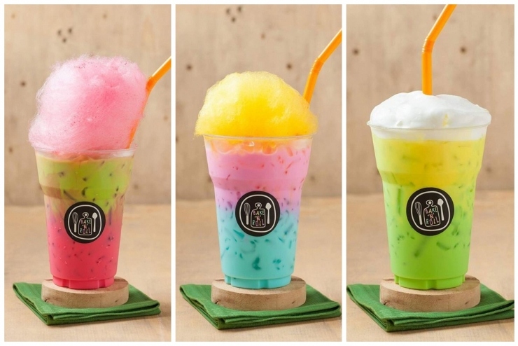 เป็นการเสิร์ฟนมเย็นสีสวย แบบแยกชั้น มีให้เลือกทั้ง นมชมพู นมคาราเมล