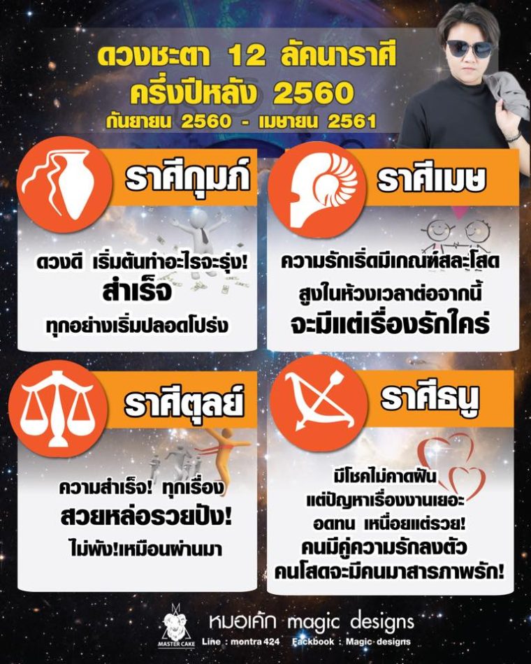 กลายเป็นเรื่องฮือฮาทั้งโซเซียล! เมื่อ หมอเค้ก Magic designs หมอดูชื่อดังในโลกออนไลน์ ได้เปิดดวง เผยชะตาว่า 4 ราศีต่อไปนี้ ครึ่งปีหลัง ตั้งแต่เดือนกันยายน พ.ศ. 2560 – เดือนเมษายน พ.ศ. 2561 จะดวงดี รักรุ่ง รวยเฮง ทำสิ่งใดก็สำเร็จลุล่วง ซึ่งได้แก่ 4 ราศี ดังนี้!