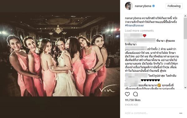 จากที่ได้มีประเด็นเป็นข่าวอยู่ในขณะนี้สำหรับกรณีของสองสาวสวยที่ได้ตัดความสัมพันธ์ฉันเพื่อนกันไปอย่าง เจนี่ เทียนโพธิ์สุวรรณ และ วุ้นเส้น วิริฒิพา ทำเอาบรรดาเพื่อนๆของทั้งคู่ต่างก็อึดอัดใจกันไม่น้อย โดยเฉพาะเธอคนนี้ นานา ไรบีนา ที่สนิทกับทั้งเจนี่และวุ้นเส้น โดยนานาได้ออกมาโพสต์ภาพกลุ่มเหล่าสมาชิกแก๊งนางฟ้า ที่เคยเป็นเพื่อนเจ้าสาวในงานแต่งงานของแอน อลิชา พร้อมข้อความว่า “ความรักสร้างให้เกิดภาพนี้ หวังว่าความรักก็จะทำให้เกิดภาพแบบนี้ขึ้นอีกครั้ง #friendforever” เรียกได้ว่าเป็นตัวกลางกาวใจของทั้งสองสาวนั่นเอง ด้านเวย์เองก็ได้มีการโพสต์ภาพในอินสตาแกรมสตอรี่เช่นกันโดยเป็นภาพของเวย์ที่ถ่ายกับภาพของเจนี่ ซ้ำเจ้าตัวยังได้มีการแท็กไปหาเจนี่อีกด้วย งานนี้ก็ต้องดูกันต่อไปว่าเรื่องราวจะเป็นอย่างไร