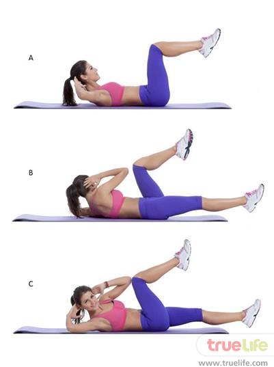 1.นอนหงาย ยกส่วนหลังและส่วนขาลอยขึ้นเหนือพื้นไม่ต้องสูงมาก โดยตั้งศอกและแขนขนานข้างลำตัวเพื่อเข้าท่าเตรียม (ใช้ศอกเป็นตัวรับน้ำหนัก)2.ยกส่วนหลัง ศอกและขาเข้าหากันให้เข่าติดอก กลับไปท่าเตรียมนับเป็น 1 ครั้ง