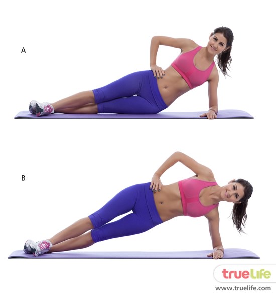 A.นอนตะแคงซ้าย ยกลำตัวช่วงบนขึ้น แขนซ้ายวางไว้ด้านบนทำมุม 90 องศากับลำตัว แขนขวาเท้าเอวB.ยกสะโพกขึ้นโดยใช้แขนซ้ายดันขึ้น ค้าง 5-10 วินาที แล้วจึงกลับสู่ท่า A จากนั้นจึงสลับข้าง ทำซ้ำ 2-3 ครั้ง
