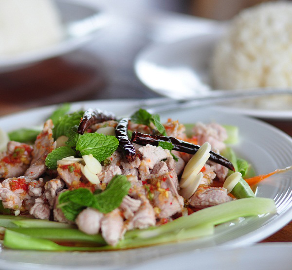 2. ผสมกระเทียม พริกขี้หนู น้ำตาลทราย น้ำปลา และน้ำมะนาวเข้าด้วยกันจนน้ำตาลทรายละลาย ชิมรสตามชอบ ราดลงบนหมูที่เตรียมไว้ โรยด้วยกระเทียมฝาน ใบสะระแหน่ และพริกแห้งทอดกรอบ พร้อมรับประทาน