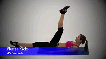นอนราบกับพื้น แขนวางราบข้างลำตัว ยกตัวขึ้นเล็กน้อยตามภาพ แล้วเหวี่ยงขาขึ้นลงสลับกันนาน 45 วินาที โดยโฟกัสที่กล้ามเนื้อหน้าท้องเป็นหลักค่ะ