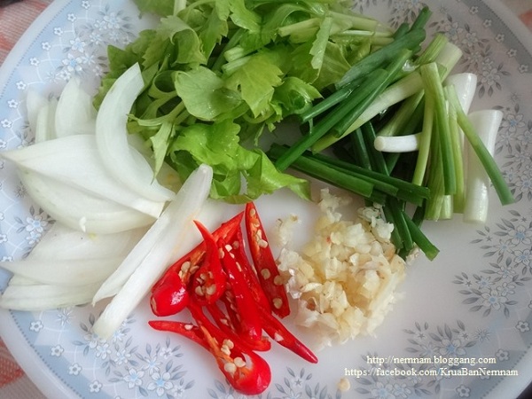 เตรียมผักต่าง ๆ ไว้ให้พร้อม (ต้นหอมหั่นท่อน ขึ้นฉ่ายหั่นท่อน หอมใหญ่ซอย พริกชี้ฟ้าแดง และกระเทียมสับ)