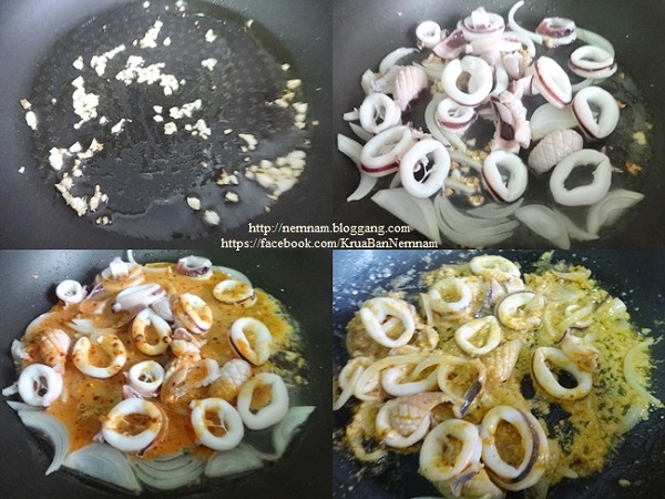 ใส่น้ำมันพืชลงในกระทะเล็กน้อย นำขึ้นตั้งไฟพอร้อน ใส่กระเทียมสับลงเจียวพอหอม ใส่หอมใหญ่ลงผัดพอสุก จากนั้นใส่ปลาหมึกลงไปผัด ตามด้วยส่วนผสมไข่เค็ม ปรุงรสด้วยซีอิ๊วขาว ซอสหอยนางรม และน้ำตาลทราย ชิมรสตามชอบ