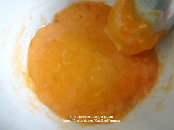 บดไข่แดงเค็มให้ละเอียด เติมน้ำเปล่าเล็กน้อย และน้ำพริกเผา คนผสมให้เข้ากัน พักไว้ (เราใช้ไข่เค็มสุกและดิบอย่างละฟอง ไม่ใช่เคล็ดลับนะคะ แต่มีไข่เค็มไม่พอค่ะ)