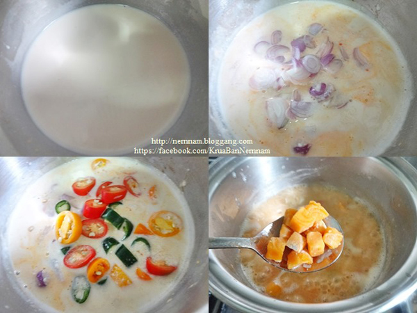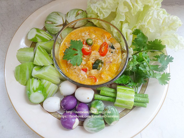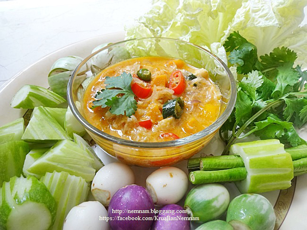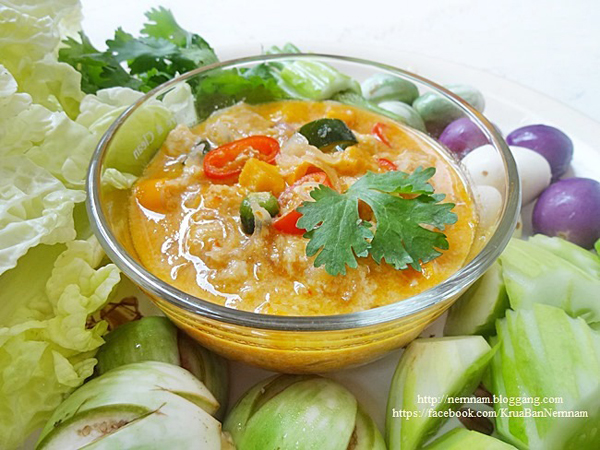 ส่วนผสม ไข่เค็ม (เฉพาะไข่แดง) 2 ฟอง กะทิ 1 ถ้วย กุ้งสด หั่นเป็นชิ้น 1/2 ถ้วย หอมแดงซอย 1/3 ถ้วย พริกชี้ฟ้าสีเขียว สีแดง และสีเหลือง 1/2 ถ้วย น้ำตาลปี๊บ 3 ช้อนชา น้ำปลา 4 ช้อนชา น้ำมะขามเปียก 4 ช้อนชา ผักสดต่าง ๆ ตามชอบ