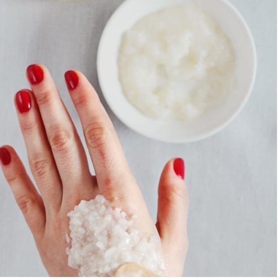 นำส่วนผสมทั้งหมดมาปั่นหรือตำให้ละเอียด จากนั้นนำมาสครับที่มือโดยออกแรงกดนวดไปพร้อมกัน นวดวนเป็นวงกลมให้ทั่วมือต่อเนื่องนาน 1-2 นาที จากนั้นล้างออกด้วยน้ำอุ่น และทาครีมบำรุงมือกับครีมกันแดดปิดท้าย