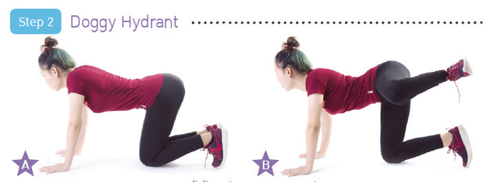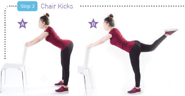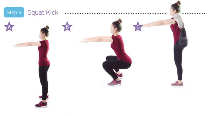 จากนั้นให้เตะขาขวาขึ้นด้านบนด้วยการยกสะโพกเล็กน้อย พร้อมกับการเกร็งก้น