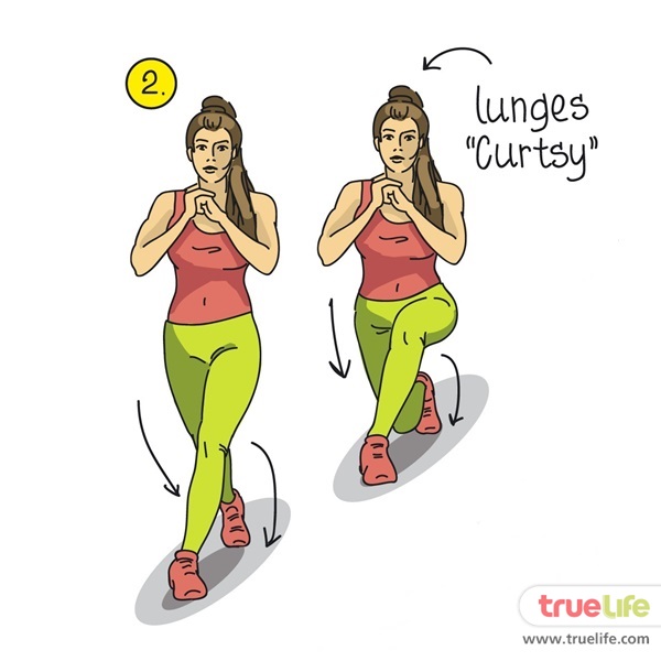 ท่าที่ 2 Lunge Curtsy ก้าวเท้าซ้ายมาข้างหน้า แล้วย่อเข่าตั้งฉาก